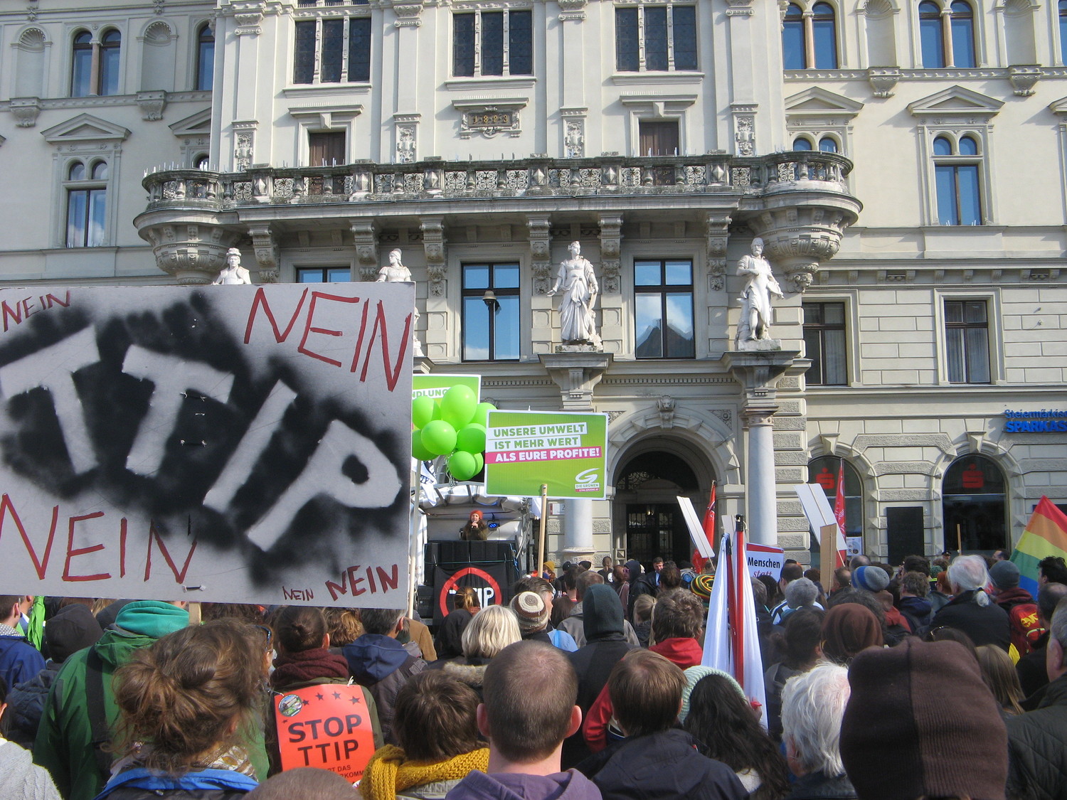 Am 18. April 2015 fand der weltweite Aktionstag gegen die Handelsabkommen TTIP, CETA und TiSA statt. Hunderttausende Menschen gingen auf die Straße und protestierten gegen Handelsabkommen, die Konzerninteressen über die Interessen von Mensch und Umwelt stellen. Auch in Wien, Salzburg, Linz, Klagenfurt, Graz, Innsbruck, Vöcklabruck, Freistadt, Wiener Neustadt, Villach und Gmunden gab es kreative Aktionen und Demos gegen TTIP, CETA und TiSA und für eine alternative Handelspolitik. Alle Infos und eine laufend aktualisierte Übersicht unter: www.ttip-stoppen.at/