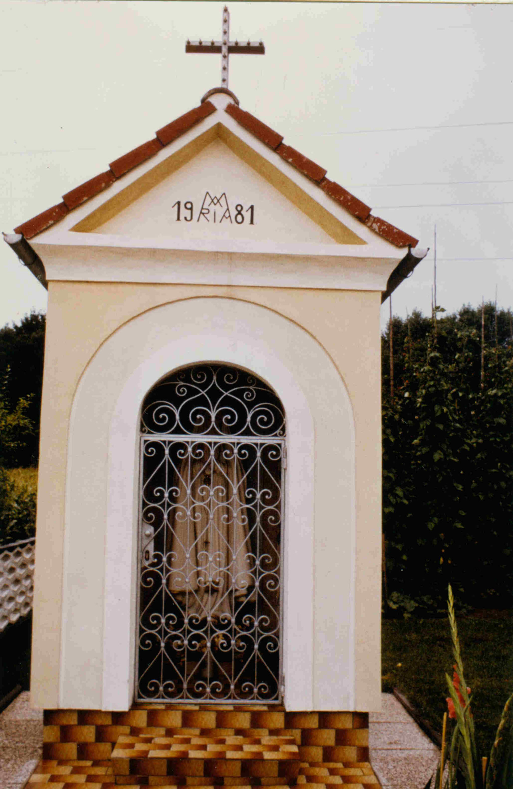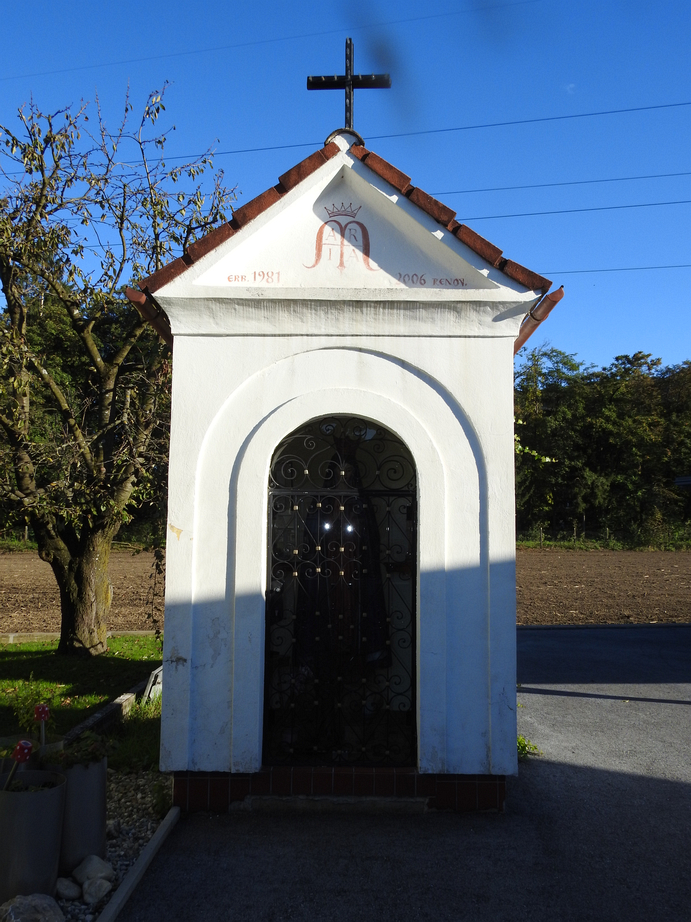 Beschreibung: Diese Marien Kapelle fällt aufgrund der Darstellung der Mutter Gottes in die Kategorie der Fatima-Kapellen. Das Rundbogentor der Kapelle ist durch ein verglastes Gittertor geschlossen. Im Inneren dominiert die überlebensgroße Fatima-Statue der Mutter Gottes mit Krone. Die ursprünglich in weißer Kleidung gehaltene Figur hat nun ein rotes Kleid und einen blauen Umhang.