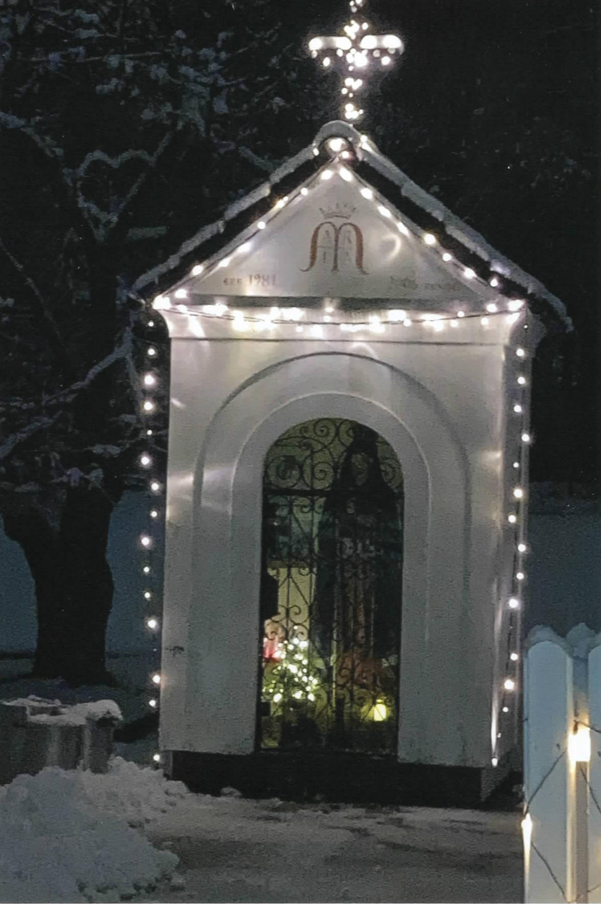 Auf der Außenseite ist im Giebel ein Marienmonogramm, links davon die Jahreszahl der Errichtung und rechts der Renovierung. Das Kreuz am Dach war schon bei der Errichtung mit Lampen versehen und leuchtet (wenn eingeschaltet) in der Nacht.
